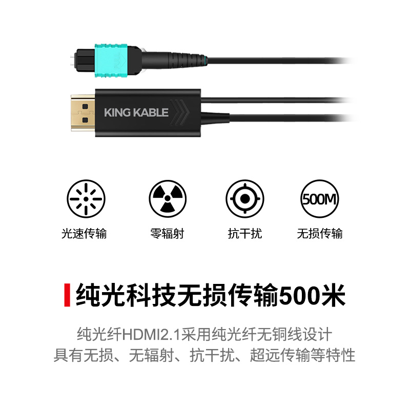 KING KABLE纯光纤HDMI线2.1版是当前国际上领先的光电转换技术,其采用高阶激光器和驱动芯片,并以独特的六芯万兆光纤芯作为信号传输载体(传输线缆无铜芯),具有无损无辐射、纤细强韧、分体可拆易穿管、支持未来升级等众多优势性能,广泛应用于医疗领域、安防监控、广播会议、船舶舰艇等环境。
