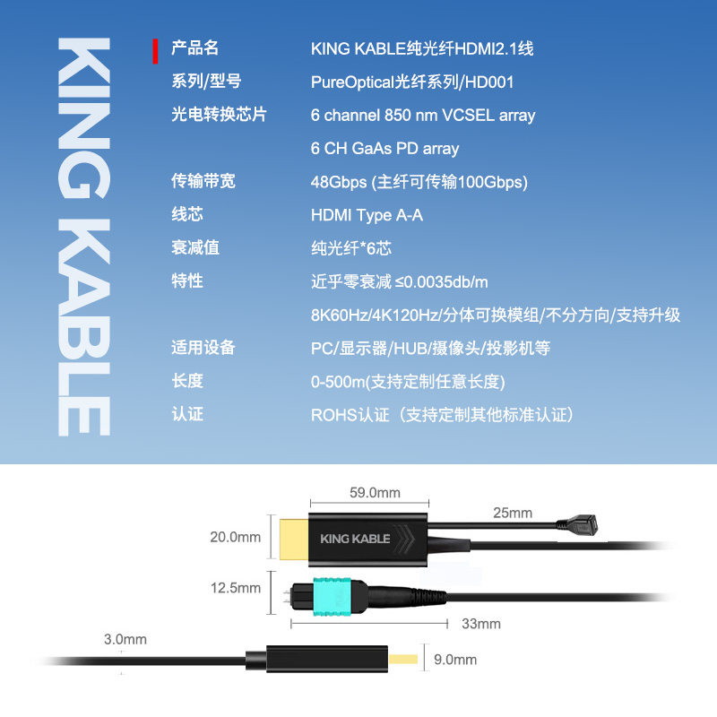 【2】KING KABLE 珑骧纯光纤HDMI2.1线(型号HD011)产品参数: